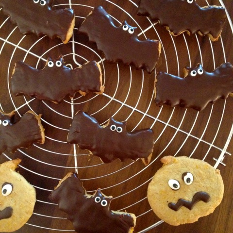 Als de koekjes zijn afgekoeld: smelt de chocolade als aangegeven op de verpakking, of in een kommetje dat in een pannetje met heet water staat. Neem een keukenkwastje (een siliconenkwast werkt perfect) en breng een mooie laag chocolade aan op de vleermuiskoekjesen leg de oogjes op hun plek met een pincet. Pompoenen of spookjes kun je versieren door de oogjes met een druppeltje chocola vast te plakken. Is chocola niet toestaan, gebruik dan wat poedersuiker aangeroerd met water als 'lijm'.