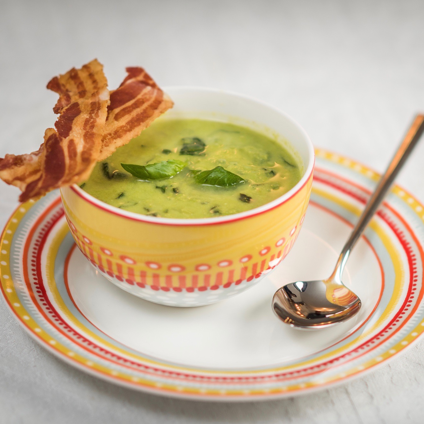 De lente hangt deze week al duidelijk in de lucht en pasen valt vroeg dit jaar. Daarom  deze week een feestelijke  voorjaarssoep in een mooi kleurtje. Diepvrieserwten blijven prachtig groen bij het koken en hebben ook veel meer smaak dan erwten uit blik.  Basilicum ligt misschien niet heel erg voor de hand, maar is juist erg lekker. Het knapperige spek maakt de wat zoetige soep helemaal af!  Leuk detail is dat ik samen met de fotograaf  weerspiegeld sta in de lepel, al is dat wat moeilijk te zien. Nou ja, níet te zien natuurlijk, maar wel grappig.