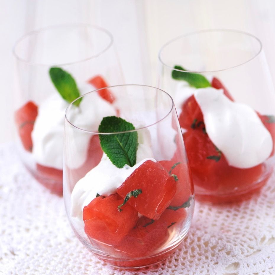 Met deze temperaturen blijf je op zoek naar verkoelende gerechten. Dit is er zo een. ‘Gewone’ meloen is hier in huis verboden, maar watermeloen kan gelukkig wel. Door hem te marineren in limoensiroop en munt wordt de smaak nog frisser! Bereid het gerecht liefst ’s morgens al, zodat de smaken goed door elkaar kunnen trekken. Serveer mét of zonder de geparfumeerde room, de meningen hier in huis zijn verdeeld. Ik vind de toevoeging zelf juist wel lekker!