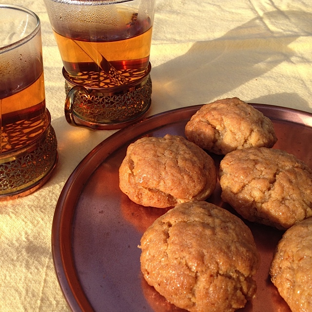 Oranjebloesemwater heeft een zeer typerende geur, die mij altijd meteen aan oosterse winkels doet denken. Het komt oorspronkelijk uit Marokko (in Nederland koop je het veelal in de Turkse of Marokkaanse winkel en soms in de toko) en wordt gedestilleerd uit de blaadjes van sinaasappelbloesem. Het combineert goed met sinaasappel en watermeloen, maar ook met rijst en stoofschotels. Waarbij je wel uit moet kijken dat het niet gaat overheersen. In deze cakejes geeft het water zijn typische smaak aan het glazuur. Of nou ja, ze heten cakejes, maar in feite heeft de substantie meer van een brossige koek. Hoe dan ook erg lekker. En voordeel is dat er geen ei en boter aan te pas komen, omdat de (oorsponkelijk Turkse) receptuur gebaseerd is op olijfolie.
