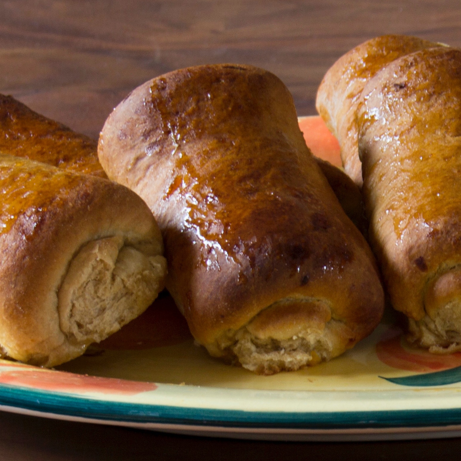 Verwarm de oven voor op 190°C. Meng een eetlepel water met een eetlepel sinaasappelmarmelade en bestrijk de gerezen broodjes hiermee. Bak in het midden van de oven in 20 - 25 minuten gaar en bruin.
