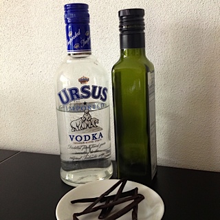 Tot nu toe onderving ik het beschikbaarheidsprobleem door het merg van een vanillepeul als alternatief te noemen. Maar dat is niet meer nodig: een kleine zoeksessie op internet leerde mij, dat je heel gemakkelijk je eigen extract kunt maken. Het enige wat je, naast de ingrediënten, moet hebben is flink wat geduld, want het duurt zeker twee maanden voor de vloeistof gerijpt is. Zes maanden is zelfs nog beter. Maar als je het nu maakt ben je tegen de kerst dus rijkelijk voorzien! Van de verschillende methodes die ik op het web tegenkwam heb ik aldus twee maanden terug een soort gemiddelde gepakt en de proef op de som genomen. Met als resultaat een flesje prachtig amberkleurig geurig vanille-extract, dat nu naar me staat te lonken in de keuken.