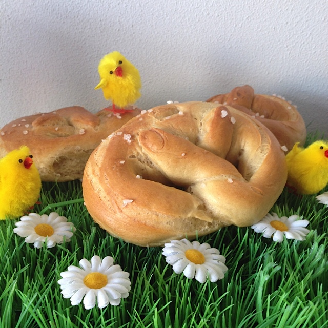 Op vakantie in zuid-Duitsland doen we ons altijd tegoed aan Brezeln, ofwel pretzels: Elke bakker heeft er deze grote, zoute krakelingen in zijn vitrine liggen en nog nooit bleek er bij navraag melk of ei in te zitten. Ze zijn knapperig van buiten en zacht van binnen en hebben heerlijke grote knisperende zoutkorrels op de korst. In Nederland zie je ze helaas niet vaak. Ik heb dan ook regelmatig geprobeerd om ze zelf te bakken. Maar steeds leek het qua substantie vooral gewoon op een broodje. Tot ik me herinnerde dat bagels voor het bakken eerst in kokend water gaan, met een harde korst als gevolg. En ja hoor, bij de krakelingen bleek dat ook te werken. Het vormen van de pretzels is nog steeds niet mijn sterkste punt, maar de smaak en het mondgevoel kunnen er prima mee door!